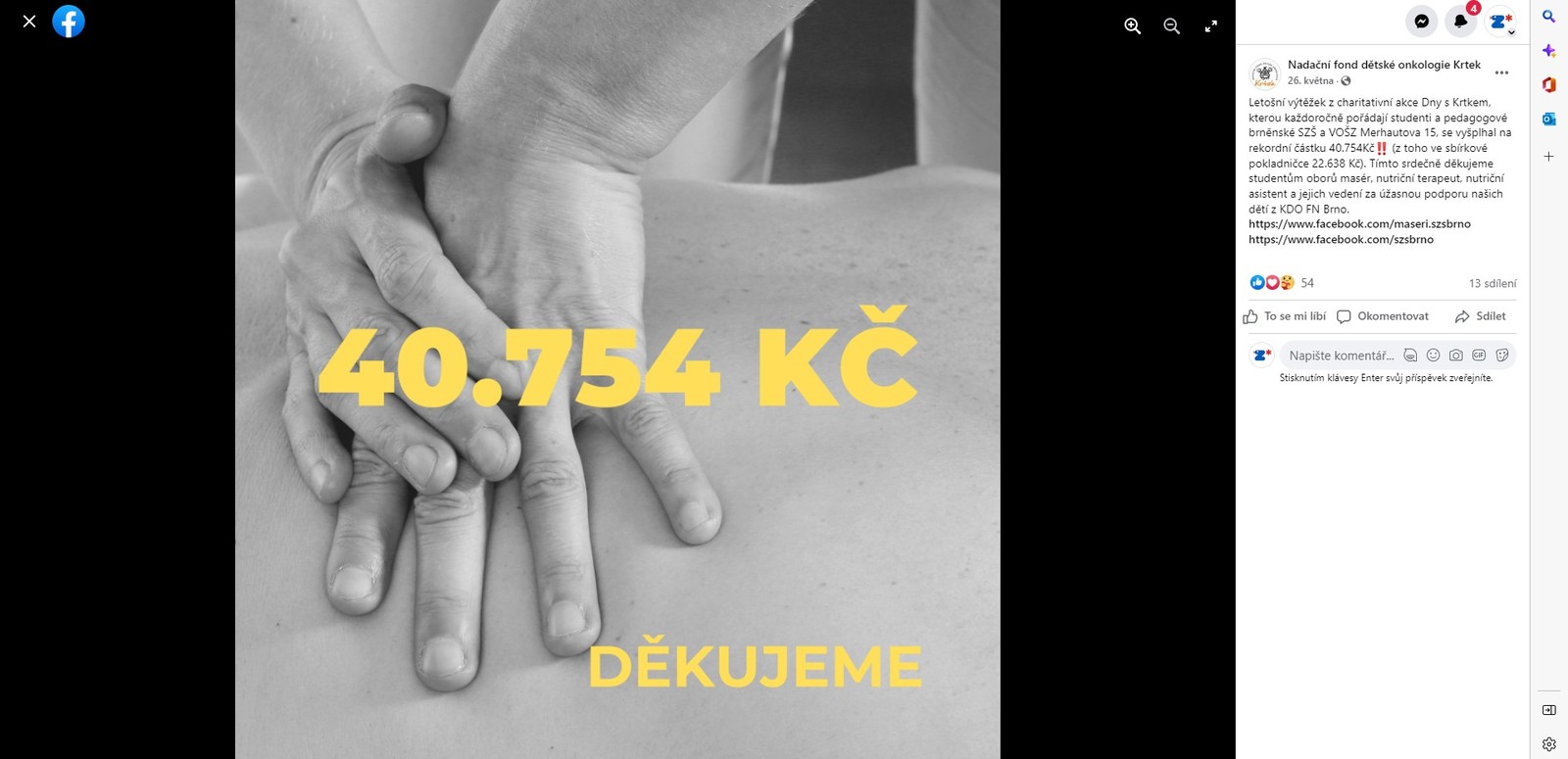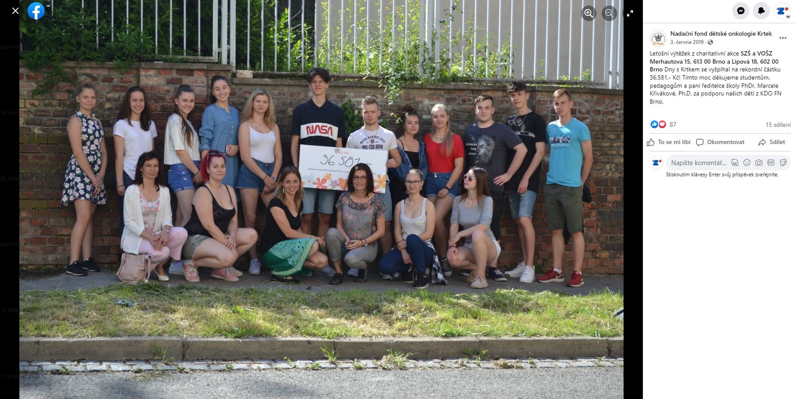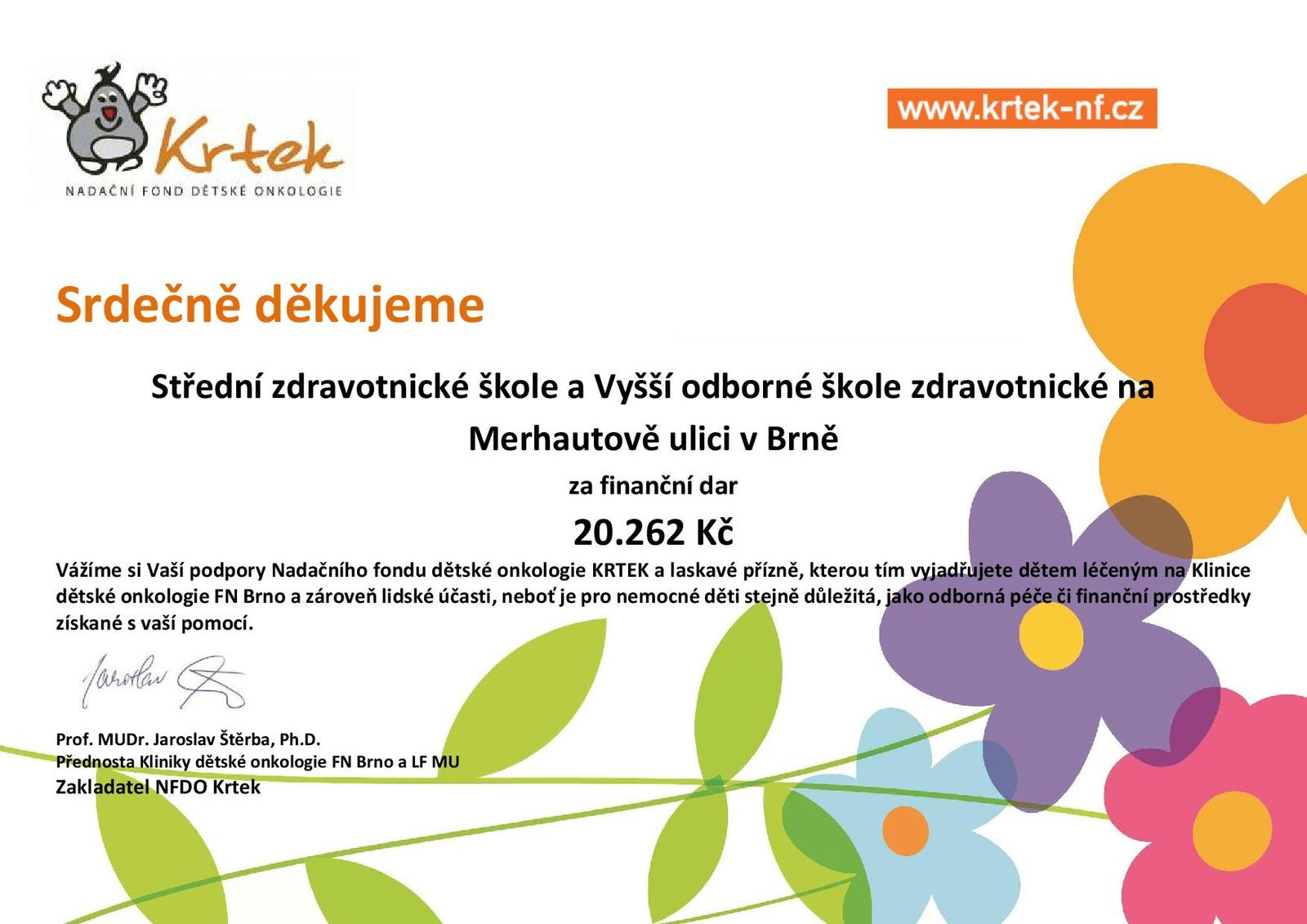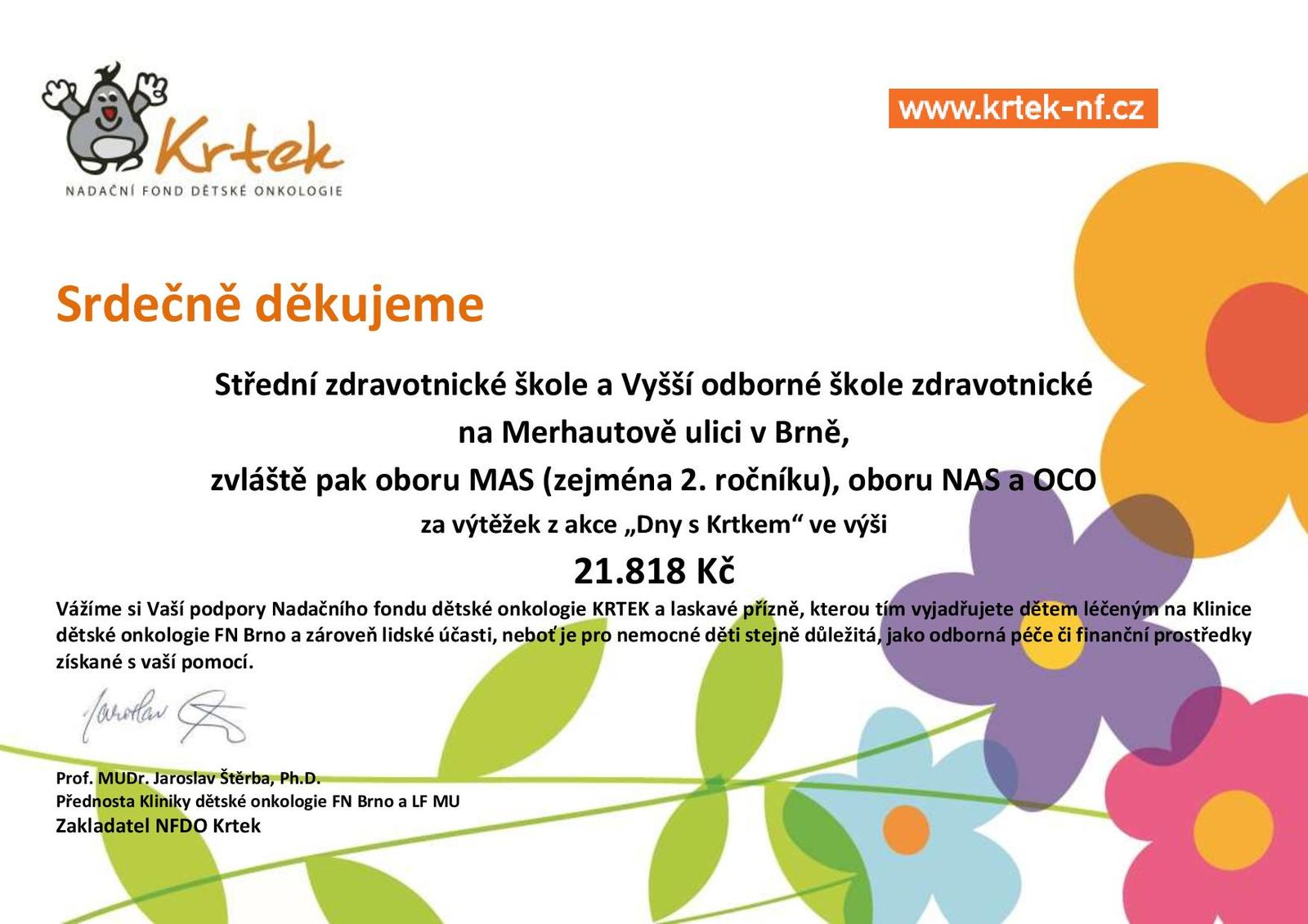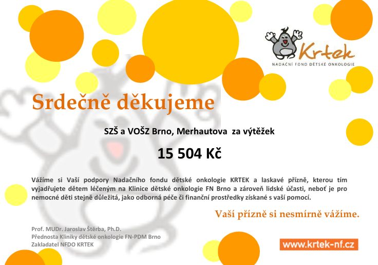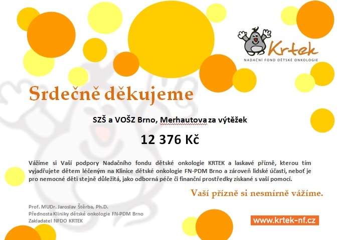 Od roku 2015 každý rok organizujeme pro Nadační fond dětské onkologie Krtek sbírku. Do akce se zapojují zejména obory Masér sportovní a rekondiční, Nutriční terapeuti, Oční optici a Dentální hygienistky. Sbírka je také doplněna prodejem drobných propagačních předmětů NFDO Krtek. Jsme rádi za spolupráci s touto skvělou a velmi potřebnou organizací.