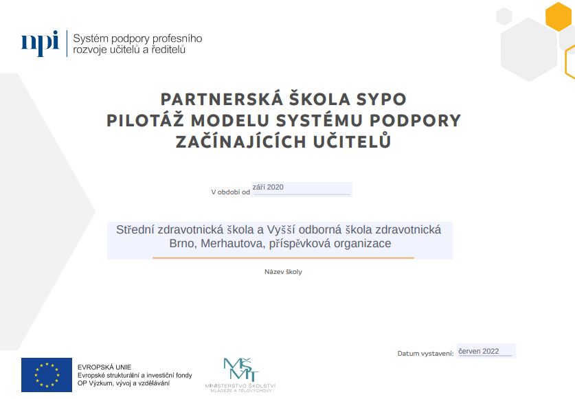 Náročné postavení a práce začínajícího učitele po absolvování pedagogické fakulty je bezesporu těžká. Naše škola si uvědomuje jejich nelehkou situaci. Záleží nám na pedagogické práci a kvalitním uvádění nových absolventů do pedagogické praxe. Poskytujeme pedagogickou praxi studentům fakult a proto jsme se rádi zapojili i do pilotního ověřování projektu NPI - SYPO Začínající učitel. V cílech projektu spatřujeme i vlastní potřeby jakou je např. nutnost kvalitní podpory těmto kolegům a také příležitost je motivovat k setrvání v učitelské profesi. Věříme, že tento projekt jim v tom výrazně pomůže. Materiály, které jsme v pilotáži ověřovali, byly velmi kvalitně zpracované, plné příkladů a podnětů. Díky této spolupráci jsme si materiály upravili pro potřeby školy a dále je využíváme. Motivovali i nás k hlubšímu zamyšlení se nad problematikou uvádění a kompetencemi nejen začínajícího, ale také uvádějícího učitele a vedení školy. Všem školám je vřele doporučujeme.