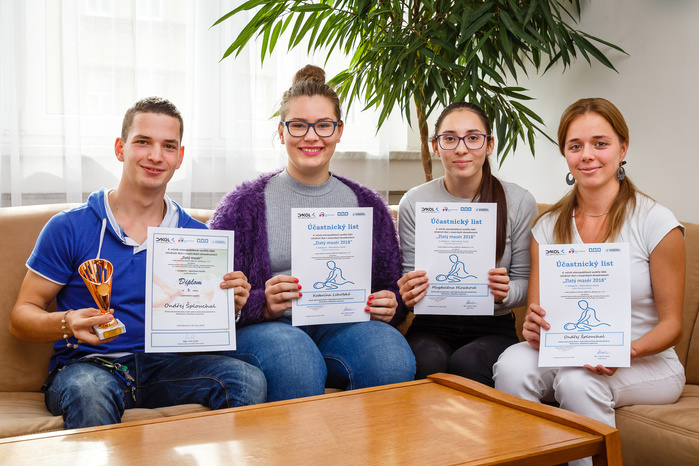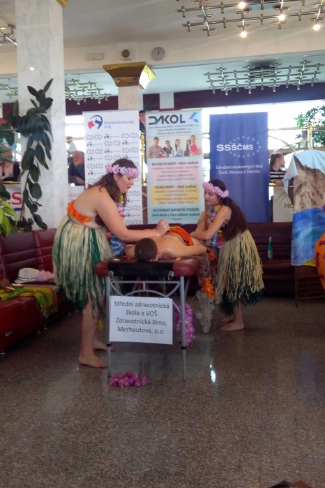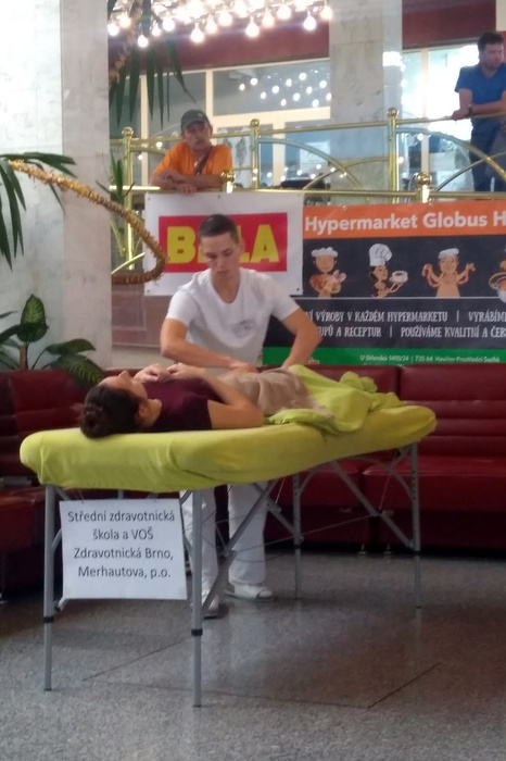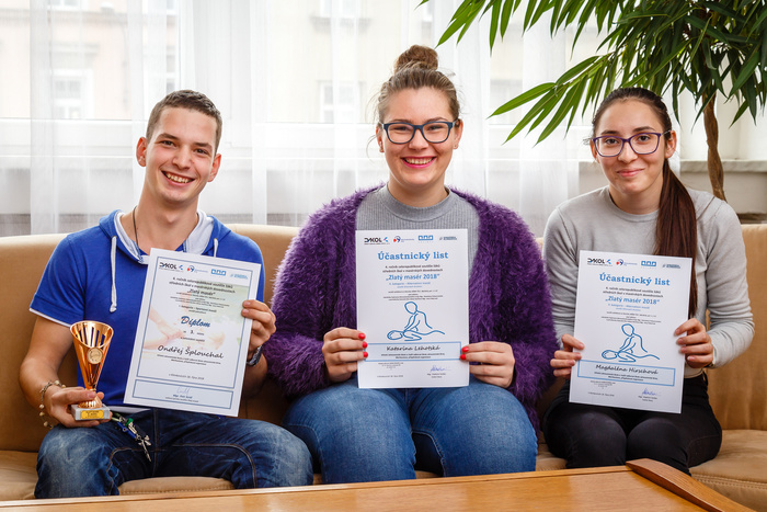 Ve čtvrtek 18. října 2018 se žáci 3. ročníku oboru Masér sportovní a rekondiční zúčastnili celorepublikové soutěže žáků středních škol v masérských dovednostech „Zlatý Masér“, konané v Sanatoriích Klimkovice. Do soutěže se přihlásilo celkem 15 středních škol z celé České republiky a 1 ze Slovenské republiky. Žáci soutěžili ve dvou kategoriích masáží. Sportovní masáž byla kategorií jednotlivců a alternativní masáž (havajská nebo bambusová) byla kategorií pro 3- členná družstva. Naši žáci se na soutěž poctivě připravovali a jejich výborné umístění je toho důkazem. Ve sportovní masáži předvedl své dovednosti Ondřej Šplouchal a umístil se na 3. místě. S Havajskou masáží se Magdaléna Hirschová a Katarína Lehocká (a masírovaným O. Šplouchalem) umístily na 6. místě. Soutěže jsme se letos zúčastnili poprvé, ale příští rok plánujeme tuto akci opakovat. Děkujeme našim žákům za reprezentaci školy a ještě jednou gratulujeme!